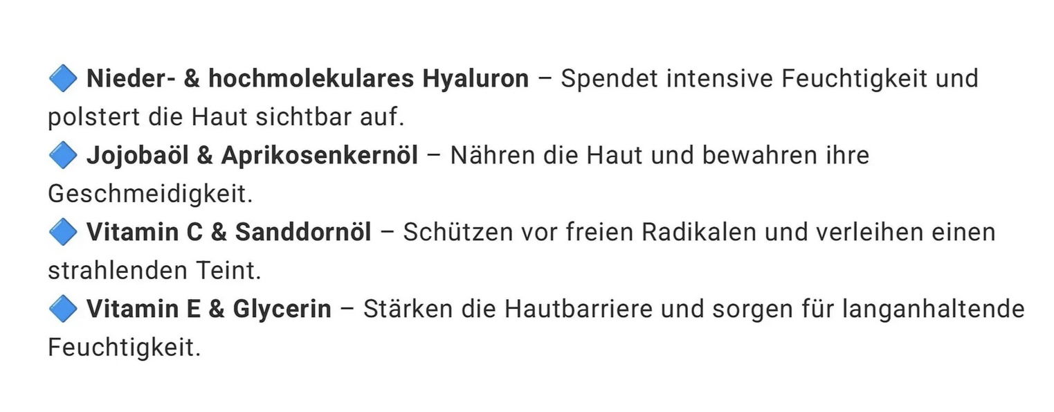 Aqua, Simmondsia Chinensis (Jojoba) Seed Oil*, Prunus Armeniaca (Aprikosenkern) Kernel Oil*, Tocopherol (Vitamin E), Ascorbyl Palmitate (Vitamin C), Lysolecithin, GlyAAcerin, Sodium Hyaluronate (Hyaluronsäure), Sodium Levulinate, Sodium Anisate (antibakterieller Wirkkomplex aus Anis- und Levulinsäure), Glyceryl Caprylate (Feuchtigkeitsbinder), Lactic Acid (Milchsäure), Beta-Glucan, Pectin (Pflanzenfasern), Hippophae Rhamnoides (Sanddornfrucht) Oil*