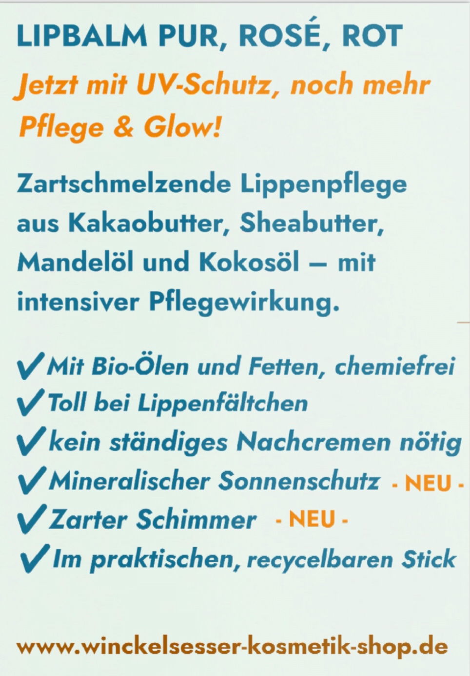 Sanfte Pflege für raue und rissige Lippen – jetzt mit noch mehr Pflege und UV-Schutz! Mandelöl, Rizinusöl & Kokosöl spenden Feuchtigkeit und sind reich an Vitaminen. Kakaobutter & Sonnenblumenwachs schenken natürliche Geschmeidigkeit, während pflanzliche Extrakte und Hyaluron intensiv pflegen. Schon beim ersten Auftragen entfaltet sich die schützende und pflegende Wirkung. 💄 Ohne Konservierungsmittel & ohne Geschmack 💄 Erhältlich in farblos sowie in zwei weiteren Farben (rosé/rot) 💄 Nachhaltige Verpackung: Plastikfrei in stabilen, ökologischen Papphülsen 💋 In 5 g und 15 g