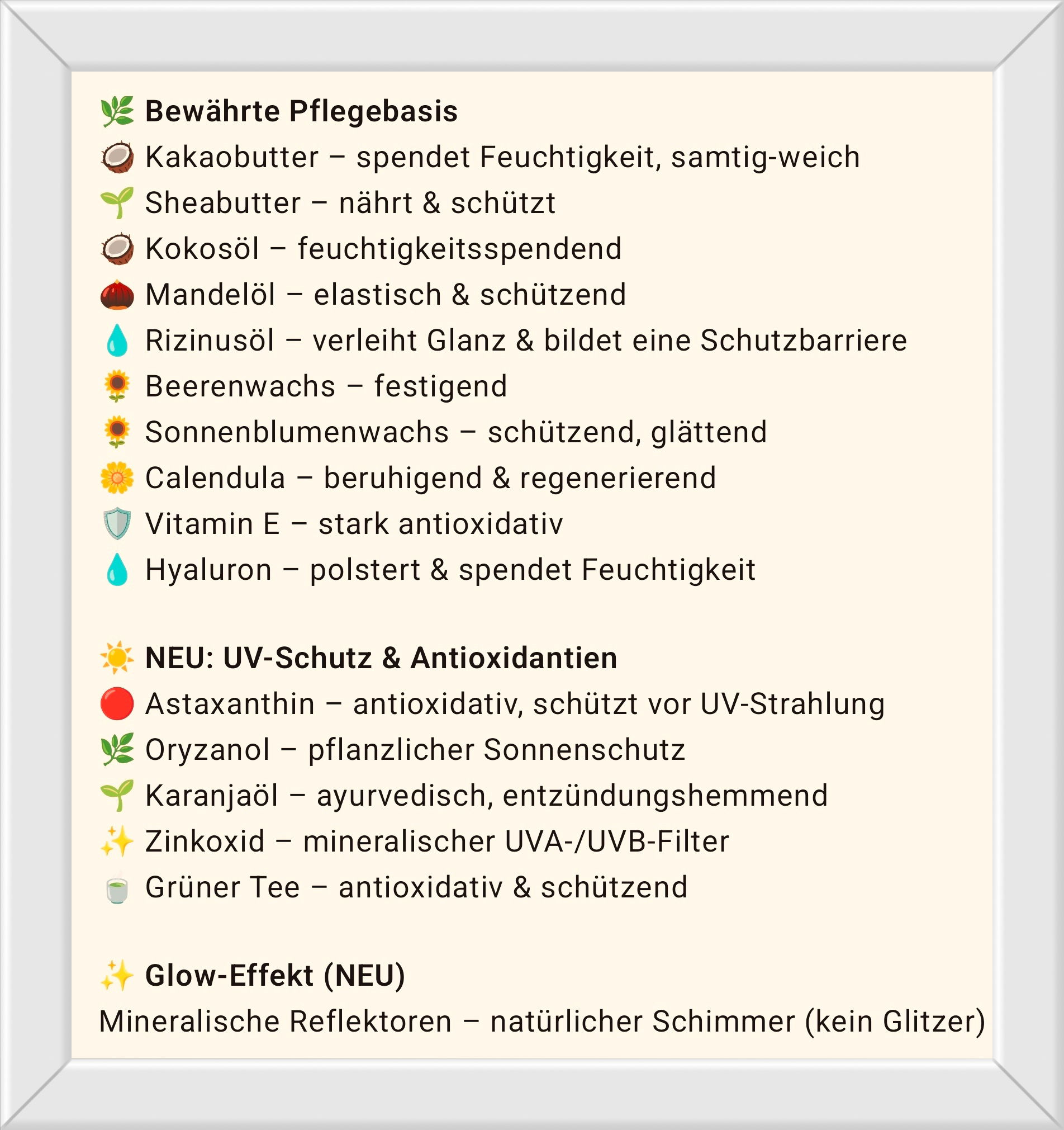 Prunus Amygdalus Prunus Amygdalus Dulcis Oil (Mandelöl), Ricinus Communis Seed Oil (Rizinusöl), Helianthus Annuus Seed Wax (Sonnenblumenwachs), Rhus Verniciflua Peel Cera (Beerenwachs), Ringelblume (Calendula) Calendula Officinalis Flower Extract, Sheabutter (Butyrospermum Parkii Butter) , Sodium Hyaluronate (Hyalorun) , Astaxanthin (Carotinoid aus Algen), Oryzanol (Wirkstoff aus Reiskeimöl), Pongamia Glabra Seed Oil (Karanjaöl), Zinc Oxide (Zinkoxid), Camellia Sinensis Leaf Extract (Grüntee-Extrakt), Vitamin E Tocopherol / Tocopheryl Acetate (stabilisierte Form)